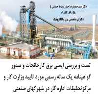 تست و بررسی ایمنی برق کارخانجات و صدور گواهینامه یک ساله رسمی مورد تایید وزارت کار و مرکزتحقیقات اداره کار در شهرکهای صنعتی
